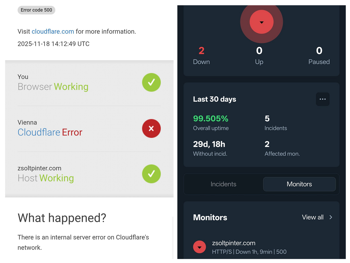 Cloudflare is ruining my uptime statNov 18, 2025ShareCloudflare is ruining my uptime statistics (and the half Internet) right now ๐Thanks for reading prwnd! Subscribe for free to receive new posts and support my work.Subscribe
