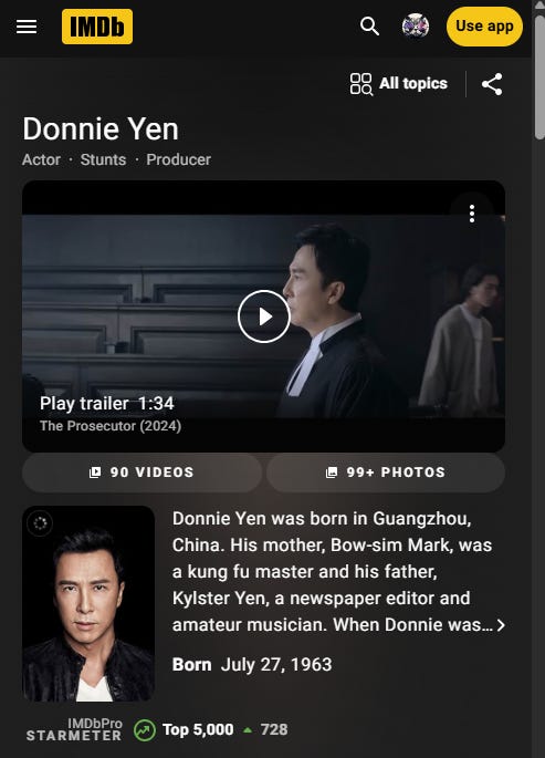 Donnie Yen is a globally celebrated Hong Kong actor, action director, and master martial artist who has had a massive impact on modern action cinema. He is best known for starring as the legendary Wing Chun grandmaster in the critically acclaimed Ip Man film series, a role that cemented his international superstardom. Western audiences will likely recognize him from his standout performances in major blockbusters, such as the blind warrior Chirrut Îmwe in Rogue One: A Star Wars Story and the deadly assassin Caine in John Wick: Chapter 4.