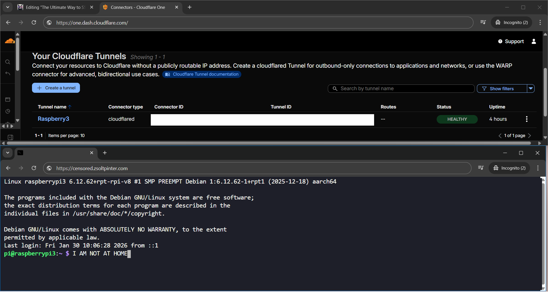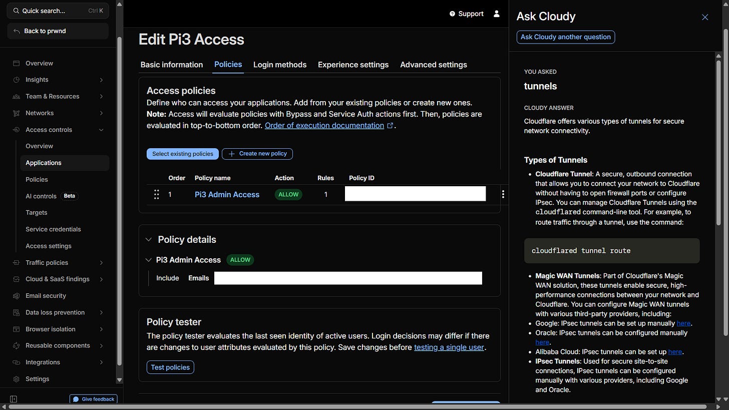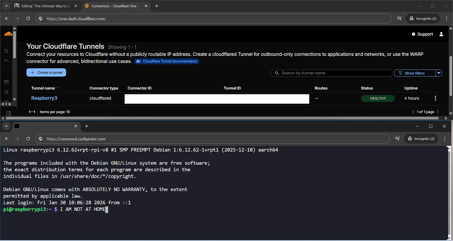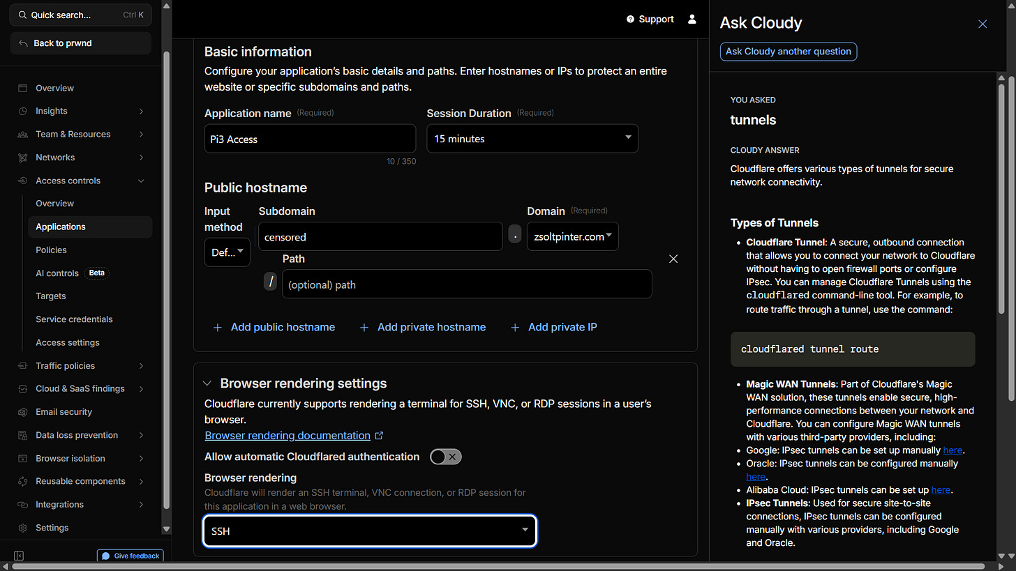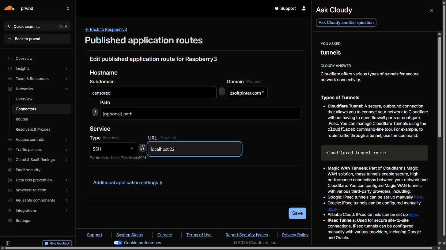Telling Cloudflare to route traffic from a subdomain straight to the Pi’s internal SSH port.)